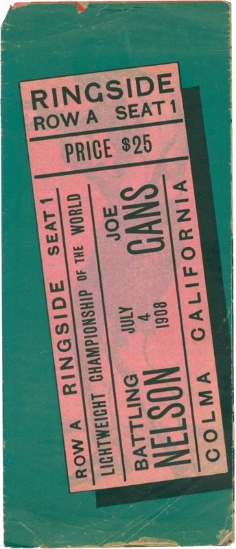 A most unique promo for the July 4, 1908 lightweight title match between Battling Nelson and Joe gans, printed by the Sea Foam Bond Co., which made tissue-thin paper usually used for carbon copies. Pamphlet has a mock ticket on the front and a double-truck rendering of a ring and a crowd on the underside, which opens to 15 x 17" to feature images of the two fighters and fight info. In remarkably good condition (VG-EX) considering its age and delicate paper.