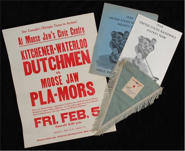 Three splendid Olympic hockey pieces. 1) 1959 U.S. National Team radio-TV brochure -- this was the team that would beat the Russians and win the gold in Squaw Valley. 8.5 x 11", VG w/mild foxing of the edges of the sleeve and brochure pages. 2) Poster for a game by the 1959 Canadian National team (playing as the Moose Jaw Pla-Moors) vs. the Kitchener-Waterloo Dutchmen at Moose Jaw Civic Center. White w/red lettering. 16 x 21", VG with light folds & creasing. 3) Cloth pennant for the 1960 Japanese National team. Green interior, light green fringe. 13 x 9 x 14", EX-MT.