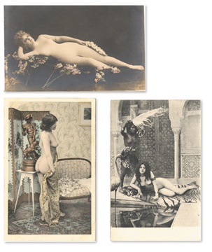 Magnificent 14.5x12x2.25" album is filled with nearly 200 early 1900's real photo French erotic postcards. Most are in full color; some in stark b/w. The amazing thing is that most are in complete sets (mostly four & eighth to a set). Extremely rare individually; to see them in sets in virtually unheard of. All are nudes and include such tantalizing subjects as boudoir scenes, a huntress, interracial, lovely girl on a swing, and some incredible voyeurs. The postcards are in the album using four corner mounts and can be taken in and out with ease. The pressure of the album has protected them impeccably, the vast majority are unposted, and they are o/w overall a stunning EX-MT. The artisan that created this album had impeccable taste and a flair for design. The postcards are interspersed with separate pages of tipped-in e prints from a period erotic magazine Le Nu Esthetique (The Nude Aesthetic). There are about 200 of these prints of various sizes and they turn this book into something truly special, in fact, the finest erotic piece we have offered. The breakdown value of the postcards alone is $50 to $100 each, making the total value of the album $10,000-20,000.