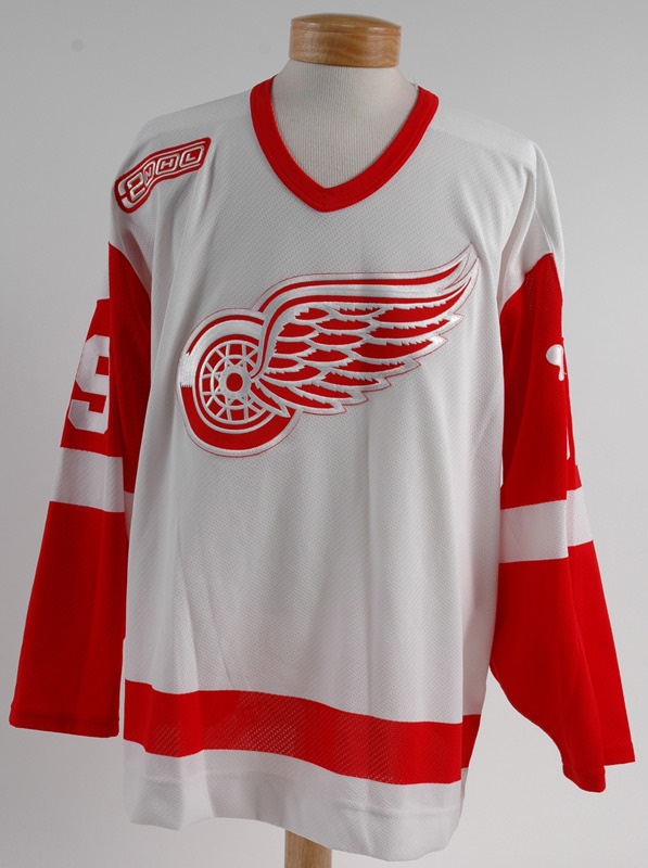 Custom size 54 Red Wings jersey made for draft day 1999. White mesh beauty is a regulation Wings jersey with the flying wheel logo across the front, while the back is nearly covered by the year (not player) number "'99" in blazing red, which is also on both sleeves in white. CCM tagging in neck, CCM and NHL logo on waist. Pristine but for some mild yellow staining on the upper back. A great and unique display piece.