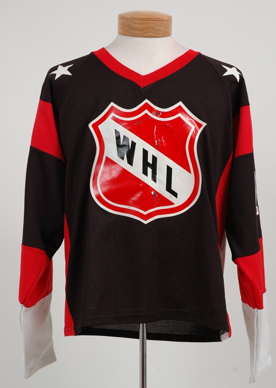 Stunning jersey worn in an WHL All-Star Game. The plucky league played for 22 years played in small cities in Western Canada and the U.S. and for its fans provided the only "big league" hockey they saw before folding in '74. The flavor of lower-case hockey linger in the black, red and white shirt on which the WHL logo and player number "13" aren't stitched but ironed on, leading to a bit of peeling and cracking on the otherwise good-condition shirt. Cooper tag in collar. Size Large.