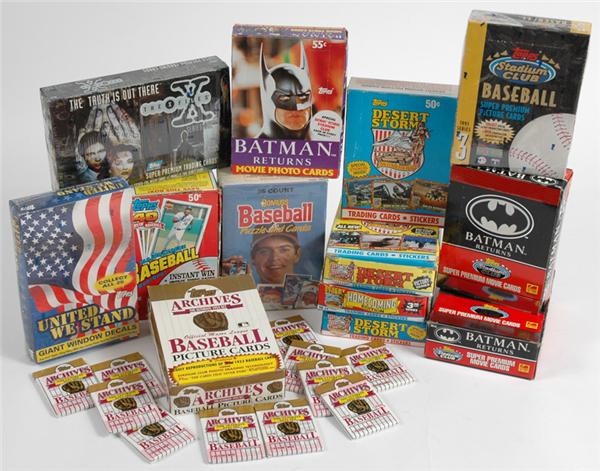 This large lot contains unopened sports (21) and non-sports (8) wax boxes from 1980's and 1990's. Unopened baseball boxes include: two (2) 1995 Topps Rack Pack; 1993 Stadium Club Series 1 (1), Series 2 (1) & Series 3 (1); two (2) 1994 O-Pee-Chee; 1994 Stadium Club Series 1; 1994 Stadium Club Series 2; Topps 1953 Archives; 1989 Topps; 1990 Topps; 1991 Topps & 1988 Donruss. Football boxes include: two (2) 1992 Topps High Number Series & one (1) 1994 Stadium Club High Number. Basketball boxes include: 1993-94 Stadium Club Series 1 (1) & Series 2 (1) & 1992-93 Stadium Club Series 2. Non-sports boxes include Topps 2001 United We Stand Decals; Topps Batman Returns; two (2) Stadium Club Batman returns; X-Files Series 1; two (2) Series; two (2) Desert Storm Coalition For Peace; Desert Storm Coalition For Peace Victory Series & Desert Storm 3rd Series Homecoming Edition. Most boxes are over wrapped in original factory plastic.