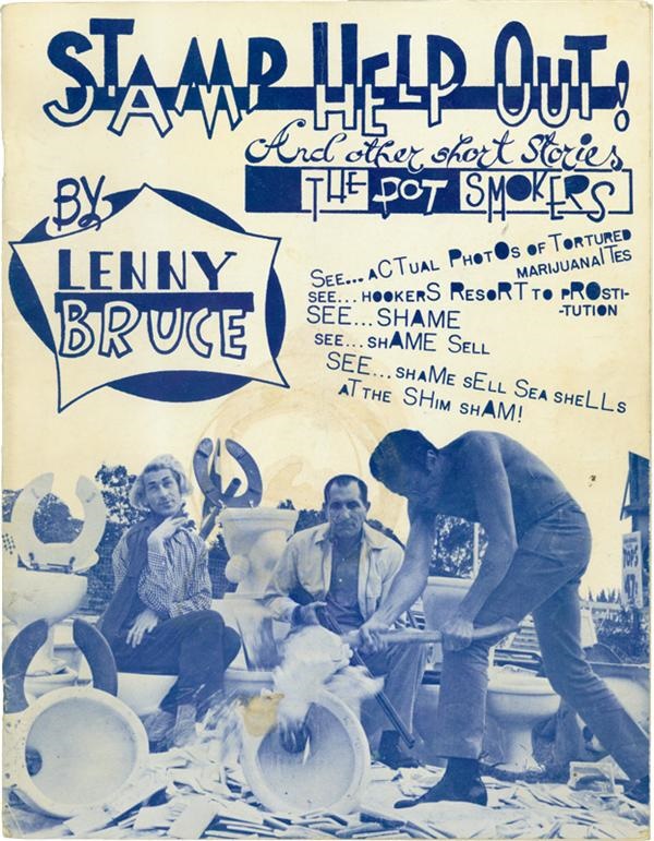 Lenny's long sought-after first book, "Stamp Help Out" (1961), a whacked-out melange of irreverent, sacreligious and scatological stories, skits and photos, including the self-parodying satire "The Pot Smokers" which played off the ignorance and fear surrounding weed smokers of the day. The book was self-published (never formally published) to sell at his concerts and performances. This is NOT the later printing that had profanities X'd out after Lenny feared the book would be used against him in his obscenity trials. He even ordered Lawrence Ferlinghtetti to destroy the copies he'd given him for his book store! VG-EX (not that it matters much) with coffee-cup stains on the blue and white cover (of Lenny smashing toilets), near-pristine pages. You may get queasy at the photo of a nude Lenny on the toilet -- an eerie augury of how he died.