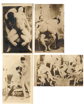 Pornographic images from a day gone by. These originated in Cuba. Twenty total pieces are each unposted. They are all hardcore, which is quite rare for this era. Subjects matter includes a great orgy scene, intercourse, oral sex and two seemingly innocent shots of a naked woman with her dog. Naughty but very, very nice. Some glue stains to the backs o/w EX+.