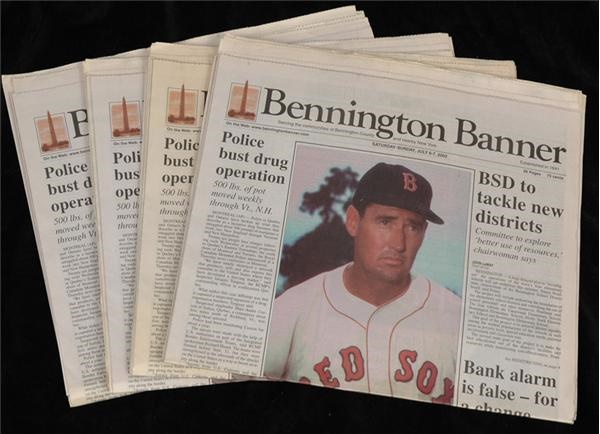 Three near pristine copies of the July 6-7, 2002 edition of the Bennington (Vt.) Banner, the day after Ted Williams died. Unusual for a broadsheet in that the Splinter's full-color photo (from 1958) is on the front page, above the caption "We'll Miss You." Williams was one of the very few people who could have earned such a departure from normal newspaper protocol. Great for Williams collections.