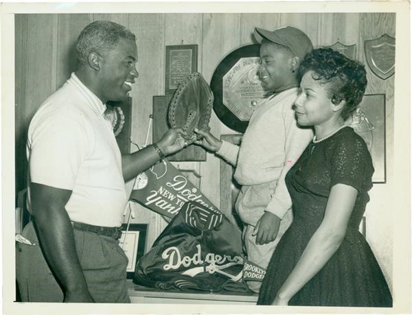 Terrific original 1957 wire photo of Jackie in his trophy-lined den with his wife and son. If he looks happy, it may be because he'd just retired and could now relax after the pressures of his history-making career. 7 x 9 photo dated Jan. 20, 1957 has International News stamp on back and notes from a Puerto Rican sports magazine in which the photo ran.