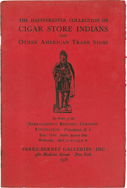 Rare edition of the Cigar Store Indian catalogue issued during a sale/auction of the antique figurines at the Parke-Bernet Gallery in 1956, which featured wooden Indians from the Haffereffer Collection. 44-page catalogue (6.5 x 9.5") has a red cover with the image of one such Indian. EX-MT condition w/pristine inside pages filled with photos.