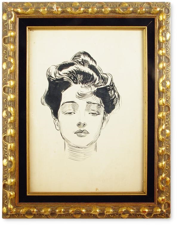 Nostalgic original sketch by Charles Dana Gibson. Although he is most famous for his creation, “Gibson Girl”, this pen and ink is equally as significant, as Gibson’s most famous rendering of the tragic Evelyn Nesbit, entitled, “The Eternal Question”, featured her hair flowing downward in the shape of a question mark. During the Victorian period, illustrators for popular magazines had as much influence on the way people acted and dressed as movies and television do today. And an original pen and ink, like this one of Evelyn Nesbit was an inspiration to any who gazed upon it. Some light paper loss (1.5” section) just to the right of her cheek, otherwise Excellent condition. Framed to 14x18”.