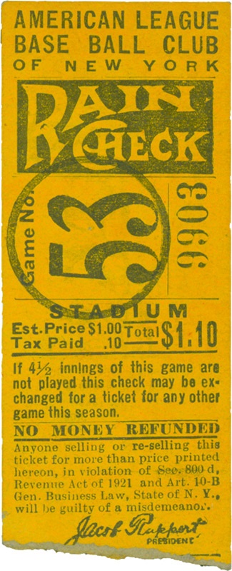 Stub for a one-dollar ticket to Yankee Stadium when it still had that new smell. No date but may be from the park's first season, 1923. Interestingly, the word "Yankee" doesn't appear. Instead, top reads "American League Base Ball Club of New York" and venue identified only as "Stadium." Light brown ducat has facsmile of Col. Rupper's signature and a Canada Dry ad on the back. VG-EX.