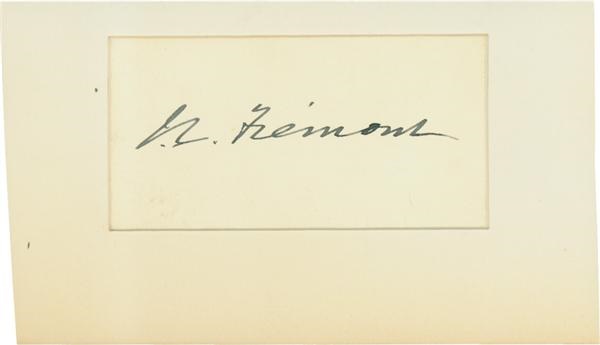 Rare signature of controversial Major General John C. Fremont, whose impetuous leadership -- and unilateral order freeing slaves in Missouri -- led Lincoln to relieve him of duty. Beautiful example in black fountain pen grading a near-perfect 10/10 is on a 1.75 x 3.25" cut sheet mounted onto a larger backing that is clean and crisp with mild foxing at the bottom.