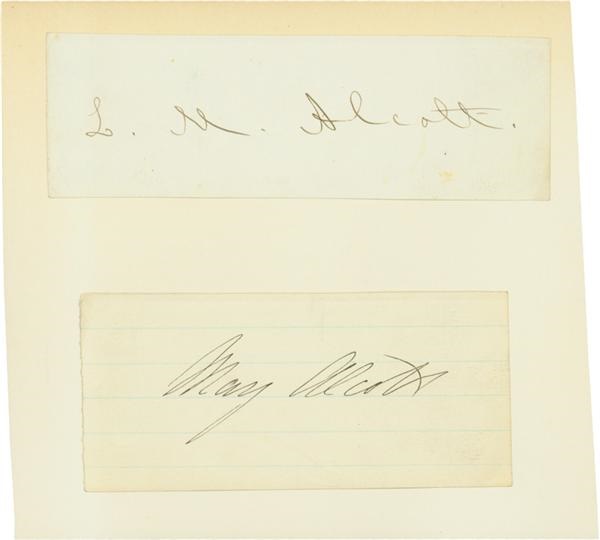 Autographs by the "Little Women" author and her youngest sister -- both of whom were the prototpyes for characters in the famous 1868 children's novel about 4 sisters growing up -- are on cut sheets and mounted onto a larger backing. "L.M. Alcott on plain sheet (1.5 x 4.75") and "May Alcott" on a lined sheet 1.75 x 4". Both signatures in black ink and NRMT. Cut sheets VG have mild foxing. Overall 5.25 x 5.5".