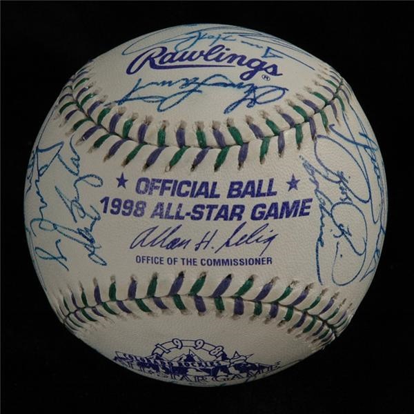 Consider for a minute that this Official 1998 All-Star Game Ball from the event at Coors Field has among its 23 signatures of NL team members a trio that has cleared 60 homers -- and 2 of them 70! One of the few balls to unite Bonds, McGwire and Sosa -- and from the year of the Mac-Sammy homer fest, to boot! Also boasts Gwynn, Glavine, Piazza, Schilling, Walker, Bichette, C. Jones, Kendall, Castilla, Nun, etc. Sigs average 8, ball NRMT.
