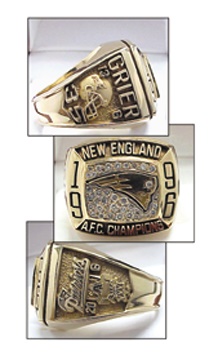 Ten-karat gold beauty is the real deal, awarded to a member of the A.F.C. Champs. Face has the Patriots logo on a field of diamonds, and surrounded by the text, "1996 New England A.F.C. Champions." Left shank features a Patriots helmet with the player's name and number (Grier 35) and the season's record (13-6). Team and Super Bowl logo on right shank. Size 10.5.