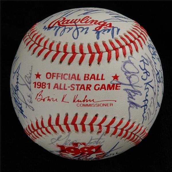 From the Midsummer Classic that almost wasn't -- the player strike led to it being played in August -- is this Official All-Star Game Ball signed by 28 members of the NL roster that won 5-4. Signatures include Carter (Game MVP), Shmidt (2-run HR), Carlton, Seaver, Ryan, Rose, Garvey, Baker, Lopes, Madlock, Sutter, Smith, Dawson, Easler, Knepper, Kennedy, mamager Dallas Green, etc. Sigs average 9, ball NRMT.