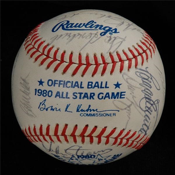 Official 1980 All-Star Game Ball is signed by 23 members of the NL squad that staged a 4-2 comeback victory behind game MVP Ken Griffey Jr.'s dinger. Junior is on the ball along with HOFers Bench (SS), Carter, Schmidt, Carlton, as well as Rose (SS), Richard, Kingman, Knight, Bibby, Tekulve, Russell, Cruz, Stearns, Hendrick, Reuss, Reitz, etc. Sigs average 7, ball is EX+.