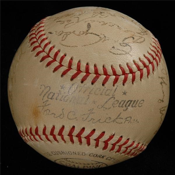 This history-drenched ONL (Frick) ball signed by 19 members of the 1949 NL All-Star squad sheds light on the little-known fact that blacks weren't chosen for a Midsummer Classic for 2 years after Robinson broke the color line! Jackie, Roy Campanella and Don Newcombe were the pioneers, and the 1st two are on the ball along with other HOFers Musial, Slaughter, Spahn, Schoendienst, Kiner, Mize, as well as Blackwell, Cooper, Pollet, Thomson, Branca, Bickford, etc. Sigs average 6-7, the ball is EX with an even light brown toning.