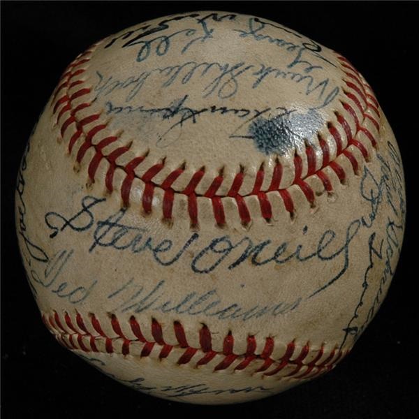 A rarity -- a pitcher's duel at Wrigely Field -- marked the 1947 All-Star Game won by the AL 2-1. This great vintage ONL (Frick) ball was signed by 26 members of the AL victors -- including HOFers the likes of DiMaggio, Williams, Feller, Boudreau, Wynn, Kell, Appling, manager Joe Cronin, Red Sox owner Tom Yawkey, as well as Trout, Gordon, McQuinn, Hegan, O'Neil, etc. Sigs average 8, ball VG-EX w/a nice tone and a bit of soiling.