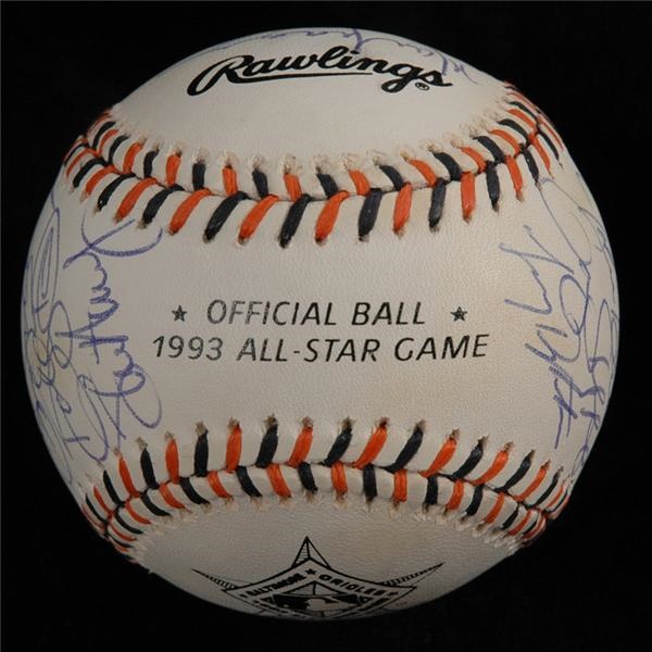 Official 1993 All-Star Game Ball is covered with the signatures of 23 members of the NL squad. Includes Cox (SS), Bonds, Piazza, Gwynn, Justice, Van Slyke, Grissom, Sheffield, Thompson, Bell, Burkett, Jefferies, Mulholland, Glavine, Grace, etc. Sigs average 9. Ball is EX-MT with special orange and black laces to honor the hometown Orioles, as game was played at Camden Yards.
