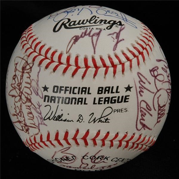 ONL (White) ball graced by the signatures of 32 members of the '91 NL All-Star team that went down 4-2 at the Skydome (Ripken's 1st All-Star MVP game). Includes Gwynn, Glavine, Clark, Kruk, Murray, Sandberg, O. Smith, L. Smith, Dibble, Browning, Bonilla, O'Neill, Smiley, Viola, Larkin, etc. Sigs average 9, ball is NRMT.