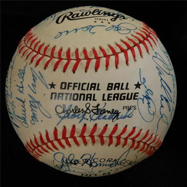 ONL (Feeney) ball streaked with the signatures of 31 members of the '83 NL All-Star squad, which took it on the chin 9-0 at Comiskey Park. Includes HOFers Carter, Bench & O. Smith, Valenzuela, Raines, Orosco, Hendrick, McGee, Oliver, Thon, Guerrero, L. Smith, Murphy, Benedict, Rogers, Matlock, etc. Sigs average 8, ball is VG-EX with very light toning.