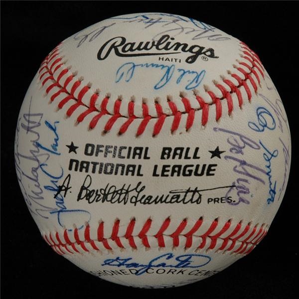 ONL (Giamatti) ball is covered with 28 signatures from the NL's 1987 All-Star squad, 2-0 winners at the Oakland Coliseum. Includes HOFers Schmidt, Gwynn, O. Smith, Sandberg, Carter, as well as Murphy, Strawberry, Franco, Virgil, McGee, Davis, Leonard, L. Smith, manaher Davey Johnson, etc. Sigs average 8, ball is NRMT.