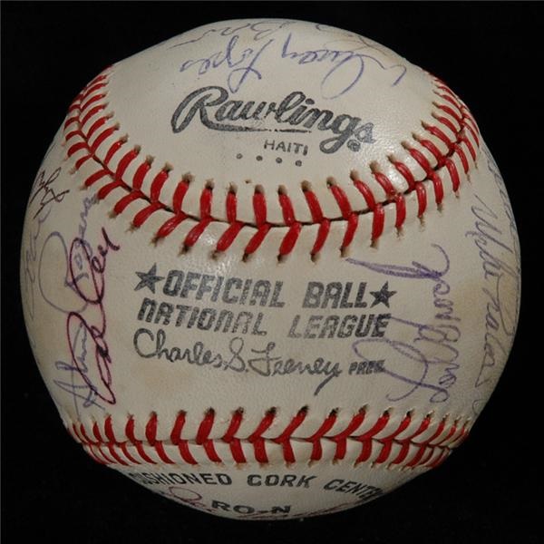 ONL (Feeney) ball signed by 22 members of the '79 NL All-Star team that staged a comeback 7-6 win at the Kingdome. HOFers Carter, Carlton, Schmidt, Brock, Morgan, Perry, and manager Lasorda, as well as Hernandez, Boone, Cey, Garvey, Lopes, Foster, Parish, Simmons, Matthews, etc. Sigs average 8, ball is EX with a few light stains.