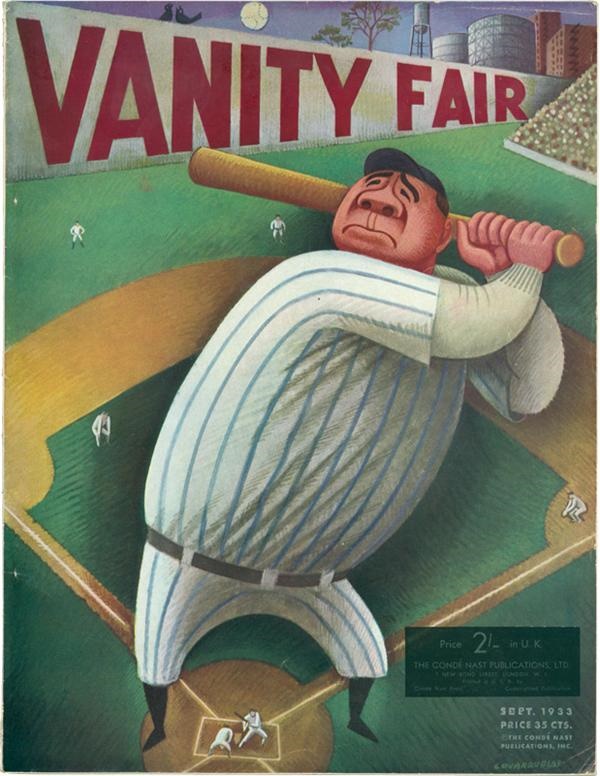 Original Sept. 1933 Vanity Fair with a mirthful caricature of Babe Ruth by Mexican artist Miguel Covarrubias on the cover. Among jocks maybe only the Babe could have made the cover of the upper-crust literary mag back then, albeit in a very broad rendering of him swinging, his balloon-like torso, tiny legs and porcine face set against a baseball diamond. 9.75 x 12.75" and NRMT, perfect just for the cover or for the entire magazine with its stories and artwork so reflective of the era. .