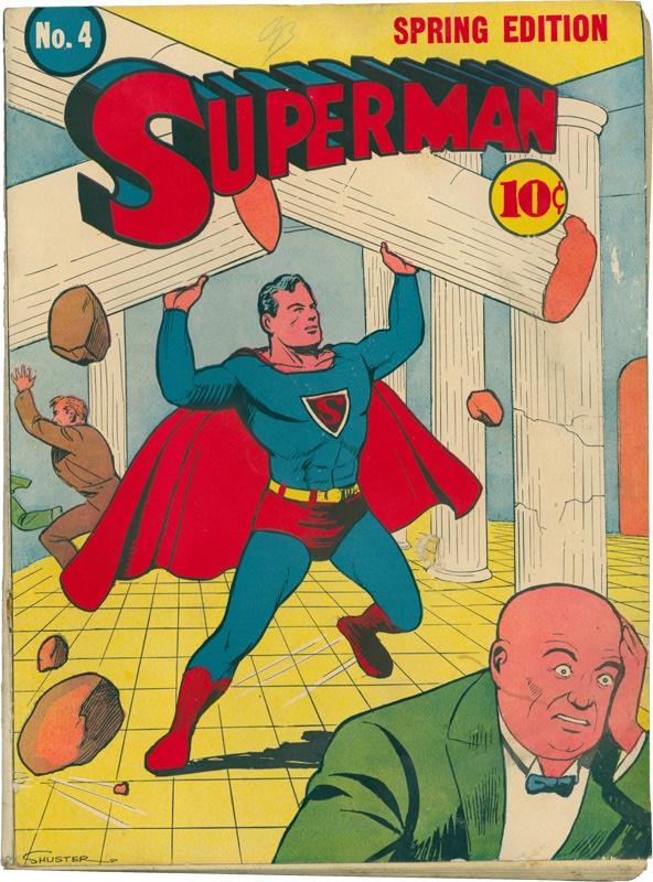 Original issue of Superman #4 (Spring 1940) with the Man of Steel rousting a baffled looking Lex Luthor on the cover. Issue contains 2 Superman stories and a centerfold crime story by Hugh Langley. Back cover has an ad for Daisy air rifles -- taboo today. G condition with light cover warping and a small shred mark under the cape, but surprisingly little paper loss o/a and very nice eye appeal.