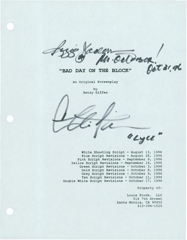 Script cover page for the 1997 flick "Bad Day on the Block" signed by Charlie Sheen and Reggie Jackson. Sheen was the "psycho next door" in the movie while Reggie played himself (no cracks about either being suited for the lead). Great Reggie marker -- "Reggie Jackson, Mr. October! Oct. 31, 96." Sheen's reads: "Charlie Sheen 'Lyle'", for his character Lyle Wilder. Sigs NRMT as is the 8.5 x 11" sheet that notes all the script revisions and has 3 bonder holes on the left edge.