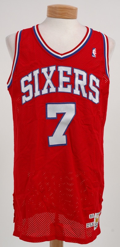 Sixers' 1980s jersey in the style made famous by Dr. J and Big Mo is from '89-90 season and was worn by scrub forward Lanard Copeland, who played in 23 games (3.2 ppg) before he was gone and his name unceremoniously removed from the back so it could be used by other players. Traces of the name can be clearly made out on the back. Red road mesh baby is tagged "89" and has "Sixers" on front and "7" on front and back in blue/white tackle twill. Sand-Knit/Official 76ers tag and "2 MLB" label on front tail. Moderate use.