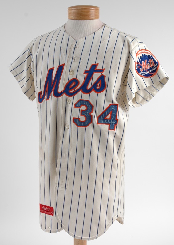 Outstanding 1973 Met jersey perfectly exemplifies the "you gotta believe" spirit of that team. Worn by reliever Phil Hennigan (30 games, 3 saves), the shirt is covered with soil, sweat and other battle scars -- something Hennigan, who won a medal for valor in Vietnam, knew about. Classic "Mets" across front with No. "34" in blue on orange tackle twill on front and back. Blue of the numbers have faded and tattered a bit, lending an even grittier look. Sewn-in label in collar reads "42 73 34". Rawlings [size] 42 tag on left front tail.