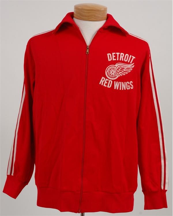 Johnnie Wilson's gorgeous blazing red warmup jacket from the Wings' 1982-83 season is a statement in "simple but says it" hockey style. Zippered turtleneck jacket has the team logo and name in a straightforward manner on left breast and white piping on shoulders in white. Adidas tag in collar with "9" flag tag, both a bit frayed. VG with some slight pilling in spots.