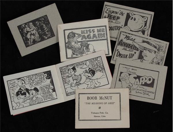 Riotously raunchy collection of eight MINT condition "Tijuana Bibles," as these 8-page, 3 x 4" pocket-porn books were called when they were an underground staple in the '30s through the '50s. The crudely drawn and written comics featured sendups of popular icons of the day engaged in sexual acts, accompanied by dirty jokes and puns. We won't repeat any in these parodies but the tone is summed up in "Donald Duck Has a Universal Desire" when he says: "Even ducks have to fuck once in a while." Other subjects include Miss Annibelle, Boob McNutt, Eugene the Jeep, Cappo, and Kiss Me Again. The roots of porn humor, later perfected by R. Crumb.