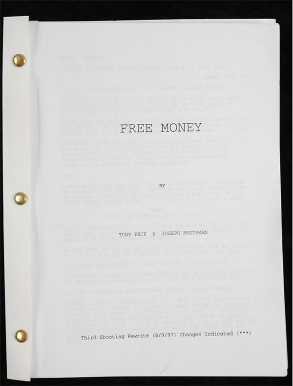 Original Script from the 1998 Charlie Sheen-Marlon Brando movie -- Brando's next-to-last -- "Free Money." Script of the screwball adventure of 2 small town heroes who plan a train robbery is a 3rd draft dated 8/9/97 and includes changes marked with asterisks. Portion of the binder cover is torn away at the top and right but 112-page script is intact and VG-EX with some rabbit-earing of some pages.