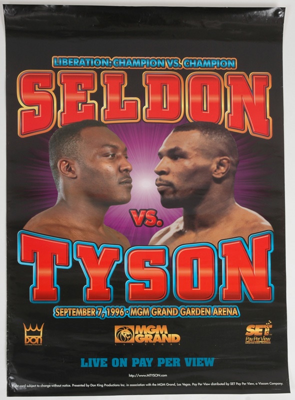 Rare on-site poster from the Sept. 7, 1996 Tyson-Bruce Seldon fight in Las Vegas has a few things you won't see today -- Tyson without a snake on his face, Don King as his promoter, and the fearsome look of a champion. All were intact as Tyson in his 4th comeback fight after prison put away Seldon in 109 seconds to unify the title. The latter's WBA belt allowed King to bill it as "Liberation: Champion vs. Champion" above facial images of the fighters. Brightly colored names are lit against a black & purple background. 24 x 36" and EX-MT. Ideal for framing/mounting.Lot also includes a VIP Press Pass for Post Fight News Conference.