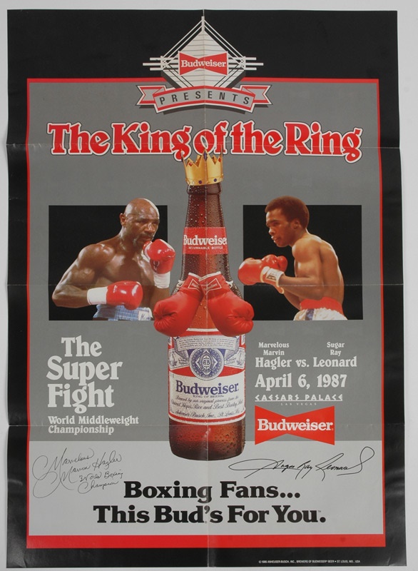 Marvelous Budweiser ad poster for the April 6, 1987 Hagler-Leonard title fight that aptly put the kings of the middleweight division around the King of Beers. Not only makes you thirsty for a cold one but for the lost glory of boxing matchups like this. 20 x 30" and NRMT with light folds and a touch of paper loss on some of the fold lines. An '80s classic.