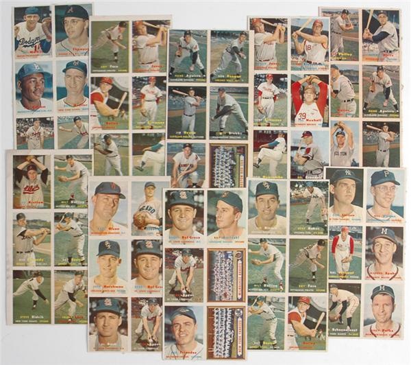Offered here is a group of 10 1957 Topps pannels for a total of 60 cards. Highlights include, Red Sox team card, Yankees team card, Spahn, Schoendienst, Larson, Boyer, Kaline, Newcombe (2) Kluszewski, Minoso, and Gilliam. Some pannels present very well and are in NRMT condition while others are a bit out of focus while some suffer from warping possibly due to exposure to water. This would make an excellent lot for a dealer to break up and sell as individual pieces.