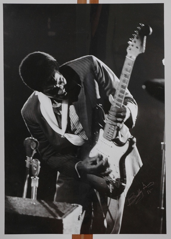 Buddy Guy has been called the greatest living axeman of classic Chicago electric Blues. He is the owner of Chicago's famous Buddy Guy's and has recorded or toured with musical legends such as Bob Dylan, Neil Young, James Taylor, Tom Petty, Elvis Costello and the late George Harrison. In 2005 Buddy was honored at the 20th Annual Rock & Roll Hall of Fame ceremonies in NYC being inducteed into "The Hall" along with such acts as The O'Jays and The Pretenders.This 19.5" x 30" black & white poster features Buddy creating his musical magic. It is signed in silver sharpie: "Buddy Guy '95". Signature is a ten.