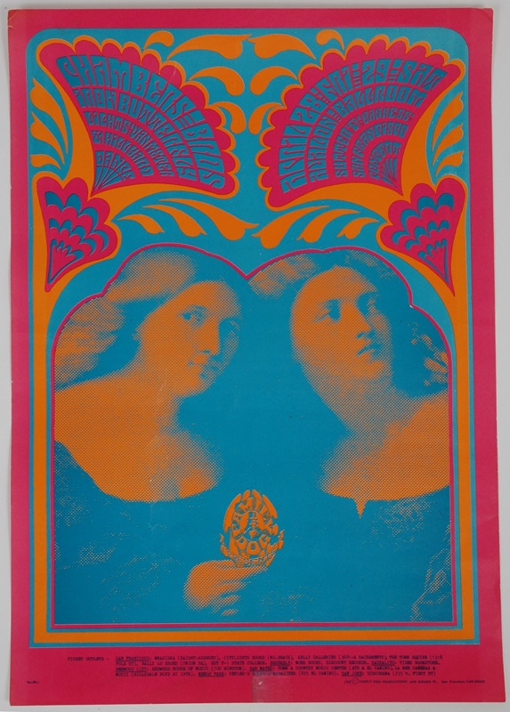 Archtypical 1967 poster from the Mecca of Psychedlic Rock by Chet Helm's famous "Family Dog Productions" artists commune shows 2 Rubenesque maidens in blue & orange beneath a winged motif and above some very famous Bay Area locations to buy tickets at, including Berkeley College and Citylights Bookstores. 14 x 20", VG-EX w/some very mild edge damage.