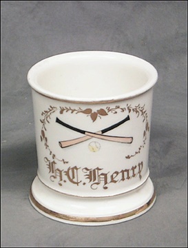 Splendid 19th century shaving mug belonged to a ball player of the era. Men would keep their own personal mugs at the barbershop in those days for their own personal use. Those with the desire (and cash) would have their occupation hand painted in full-color designs. Baseball mugs are among the rarest and most desirable of the "occupational shaving mugs." They are equally desired by shaving mug and barber collectors as well as baseball collectors. Marvelous crossed bats and baseball design leads the mug. The name of the player, "H.C. Henry" is hand painted on the side in brilliant gold leaf design. Bottom is marked with the name of the illustrator. Startling EX-MT.