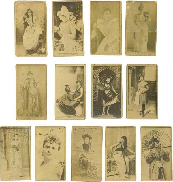 Thirteen early 1900s Sweet Caporal Tobacco Actress Series cards, the distaff set's answer to Sweet Caporal's T206 baseball card series. Actresses here include Julia Arthur, Pauline Hall, Miss Benney, Mrs. St. Henery, Mlle. Rordame and other houeshold names of the era. Cards are 1.25 x 2.5" with sepia toned images. Sweet Caporal ("The Old Reliable") name on back. Cards are VG with curling and edge and corner damage but what history.