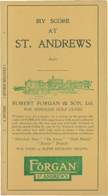 Vintage (1930s-40s) scorecard from Golf's version of Lourdes -- St. Andrews Golf Club, the world's oldest and certainly most famous surviving golf course and home of the British Open. Duffers have traveled to the hallowed course on Scotland's east coast as pilgrimmage to golf's roots. Card was printed by Forgan & Son, a golf-club company and reads "My Score at St. Andrews" on the front top. Inside of the card charts the yardage and pars for the club's 3 courses and the back diagrams them. 3.25 x 6" and NRMT with an antique light brown tone.