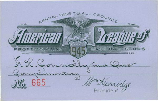 Lot # 25: Hall of Fame Umpire Tom Connolly's 1945 American League Admittance Pass