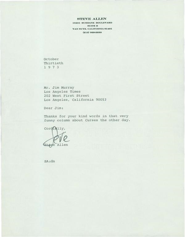 Three more letters from the original "Tonight Show" host lauding Murray's work in non-sports-related columns. Dated Oct. 13, 1973, Dec. 1, 1977 & Oct. 19, 1972, all on personalized Steve Allen stationery and signed "Steve" in black marker. One letter asks Murray to contribute some columns to a book Allen was writing about American humor. In another Allen says he's passing around copies of one column (enclosed) to friends. Letters 8.5 x 11" and NRMT with very light fold marks.