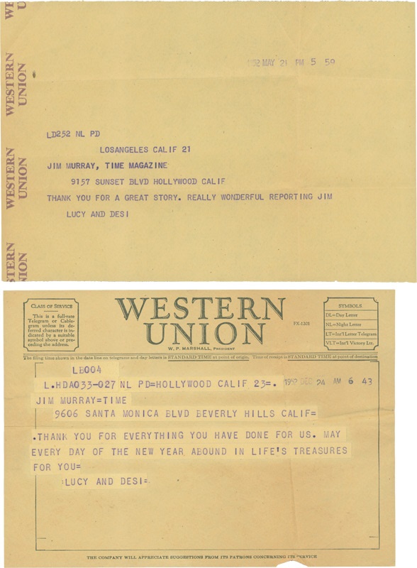 Grateful telegrams dated May 21, 1952 & Dec. 24, 1952 from America's favorite TV couple to Murray, who was then writing for Time Magazine. First reads: "Thank you for a great story. Really wonderful reporting Jim. Lucy and Desi." Second: "Thank you for everything you have done for us." Raves from newspaper people like Murray were critical to the success of "I Love Lucy." Both telegrams Ex and the 1st includes the original envelope.