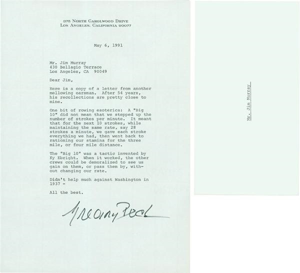 Pulitzer Prize winner Jim Murray (1919-1998) , whose poetic prose graced the L.A. Times from 1961 until his death in 1998, has been dubbed the best sports writer in history by several of his colleagues, friends and admirers. When Murray won the Pulitzer Prize for commentary in 1990, he became only the fourth sports columnist to receive the honor. Murray's circle of friends reached beyond the jock set to the highest rungs of the acting and political circle, as the favorite columnist of sports-crazed VIPs who were entranced by his cut-to-the-chase style. Offered here is a letter to Murray from legendary actor Gregory Peck discussing rowing. The letter is from 1991 and in NM-MT condition. It has an amazing signature which grades 9 out of 10. The letter is accompanied with its original envelope.