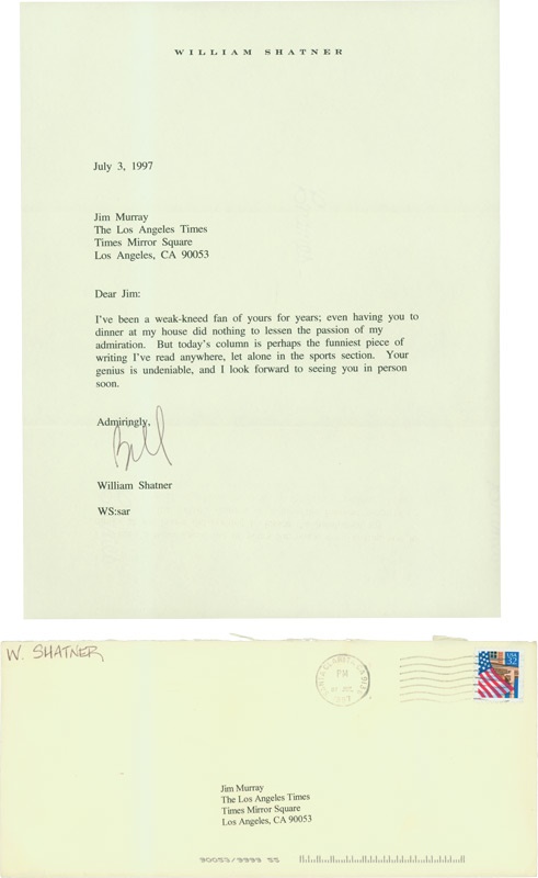 Captain Kirk wished for Jim Murray to live long and prosper in this July 3, 1997 letter typed on Shatner's personal stationery, writing, "Today's column is perhaps the funniest piece of writing I've read anywhere, let alone in the sports section. Your genius is undeniable." Signed, "Admiringly, Jim," with the name in black ink. 8.5 x 11" and NRMT w/2 light folds.