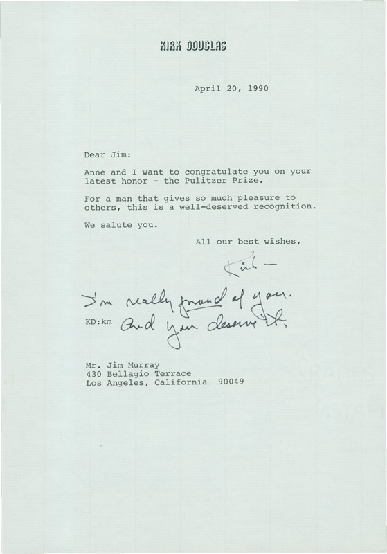 Typed letter of congratulations to sportswriter Jim Murray following his Pulitzer Prize victory was created by Douglas April 20, 1990. Signed by the legendary actor with an additional notation that reads, "I'm really proud of you. And you deserve it.", in black felt tip that grades a 8.5/10. Kirk's personal stationery displays its original mailing folds but is otherwise in EX-MT condition.