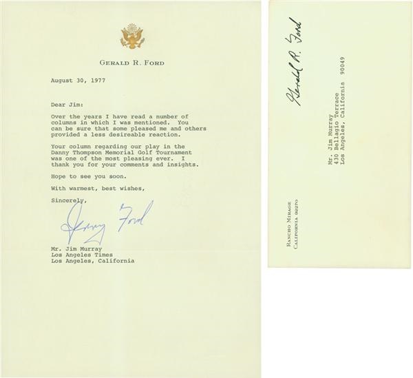 Great Gerald Ford signature on stationery with the presidential seal in gold. Letter dated August 30, 1977, seven months after Ford left office, praising Jim Murray column about a charity golf tourney. Amusingly, and a bit embarrassingly, Ford wrote that some of Murray's writings about him "pleased me and others provided a less desireable reaction" -- misspelling "desirable." Signature in blue ink is NRMT as is the 7 x 10" letter, w/2 light folds.