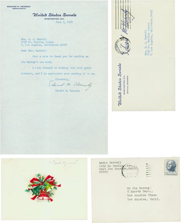 Thank-you note dated June 9, 1965 from Sen. Edward Kennedy typed on his personal U.S. Senate stationery to someone who'd sent him a copy of Jim Murray's book. Note was later sent to Murray. Kennedy's signature in watermark pen NRMT as is the 6.25 x 9" letter w/2 light folds. Includes original U.S. Senate envelope w/Kennedy's facsmile signature and the envelope sent to Murray.